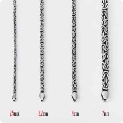 Серебряная цепь плетения Византия или Лисий хвост с чернением – увесистая и крупная, обладает замысловатым дизайном и является красивым украшением сама по себе. Можно выбрать оптимальный диаметр цепи, самый крупный из предложенных достигает 7 мм. Также вы можете подобрать длину, которая варьируется от 45 до 80 см. Максимальный вес цепи с плетением Византия – 100 г, и лучше всего она сочетается с большими и средними оберегами из серебра с чернением.